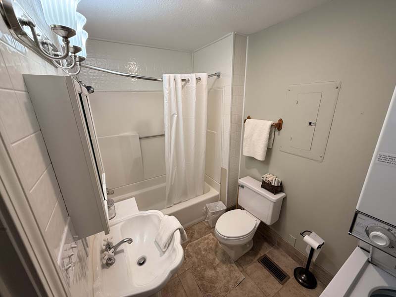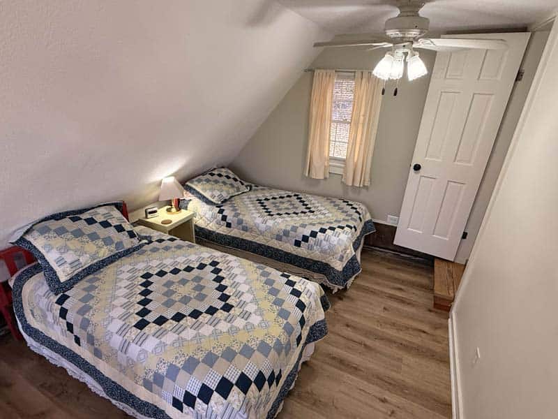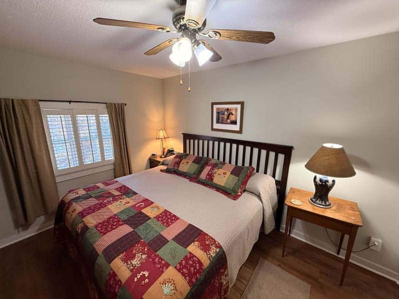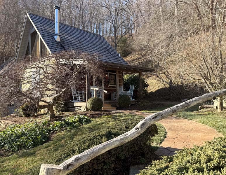 A two-story authentic log cabin originally from the Shelton Laurel community in Madison County North Carolina was moved to Boyd Mountain as Boyd’s guest cabin in 1975 and remodeled for a cabin to rent in 1989. The two-bedroom cabin will accommodate up to four people. The downstairs log interior has a kitchen, dining, and living area with a wood-burning fireplace and central heat and air conditioning. The separate bedroom has a King bed and bath downstairs with tub/shower and twin beds in the loft with a bath. The cabin is equipped with a washer and dryer. This cabin was originally Boyd’s guest house and overlooks the largest pond and the beautiful waterfall with a sitting area. Enjoy an outdoor firepit and wireless internet access at your cabin.