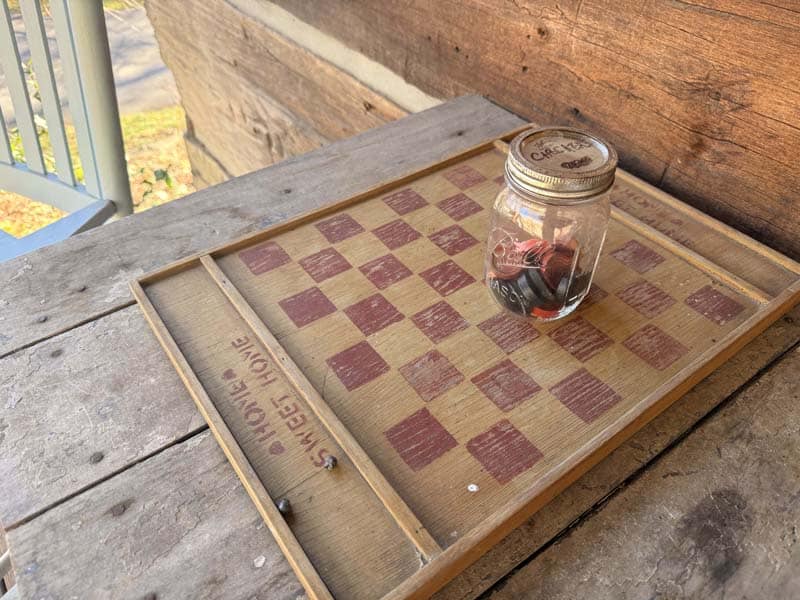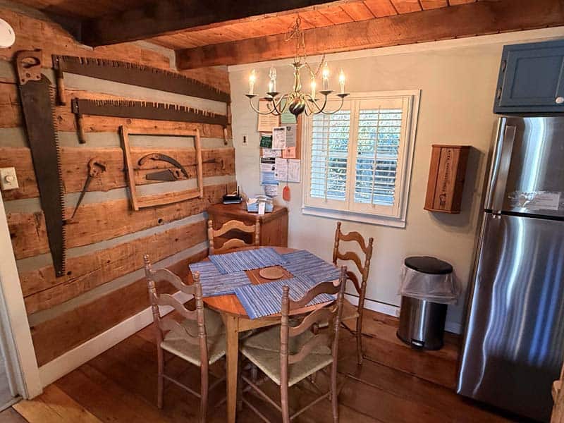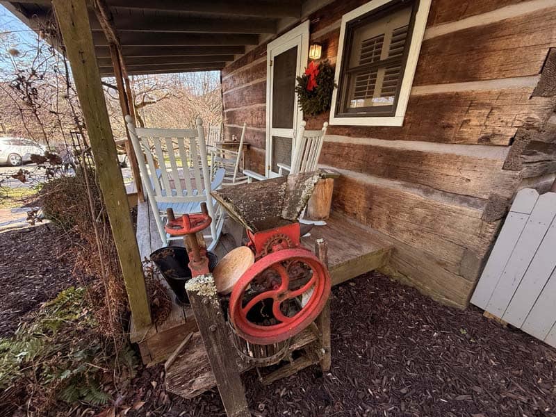 This cabin was built by the Shelton ancestors of Shelton Laurel, North Carolina. This cabin was located in a quiet cove in Madison County, NC, close to Mars Hill and 20 miles from Asheville. The cabin was built during the year of 1868, and moved to its present site on Boyd Mountain in 1975. The cabin is 18′ x 20′ and originally had four doors and one window. The logs are of virgin yellow poplar timber and were all hand hewn with a broad axe, and dove-tailed into a mountain cabin of a story and a half. The half is the loft. the original floors are presently used in the cabin. The cabin was originally chinked with red clay mud and the inside walls were covered with many layers of newspapers and magazines which were attached by a paste of flour and water. The foundation was laid with stacked field stones. All floor joists and rafters are presently used were hewed by hand. The roof was constructed of hand made white oak splits, today called shingles. Many a mountain man and his family have walked through these doors, so sit back and enjoy a cabin of the past.
